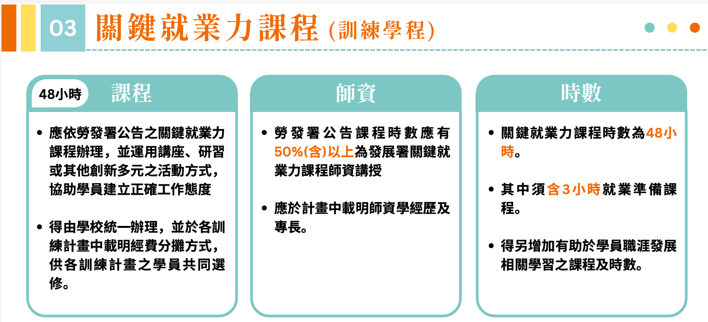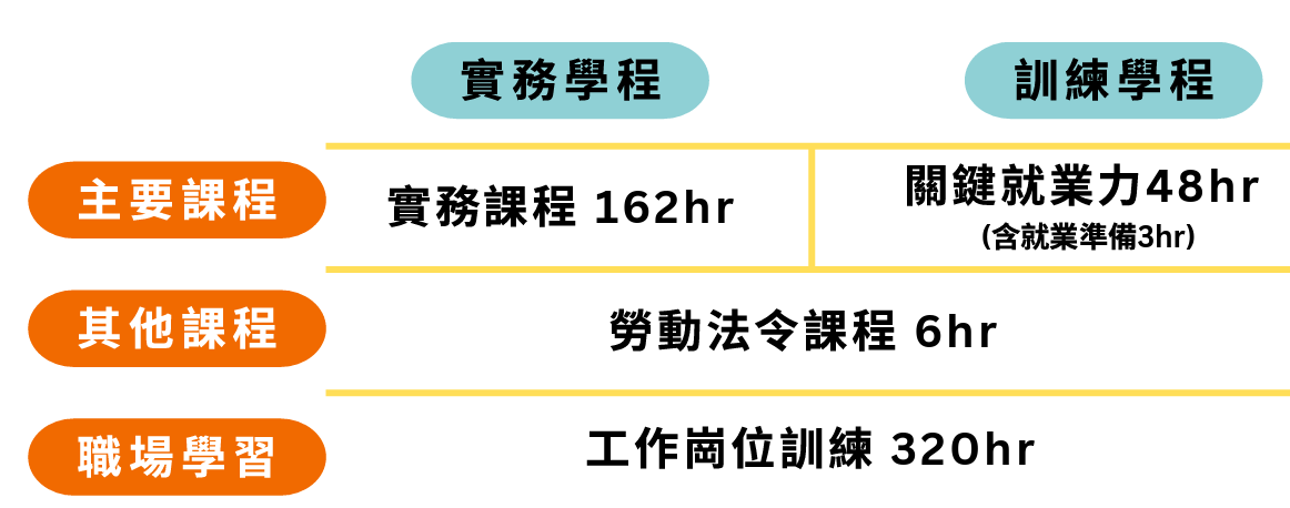 關鍵就業力課程及就業準備48小時 勞動法令6小時 工作崗位訓練320小時等內容 |