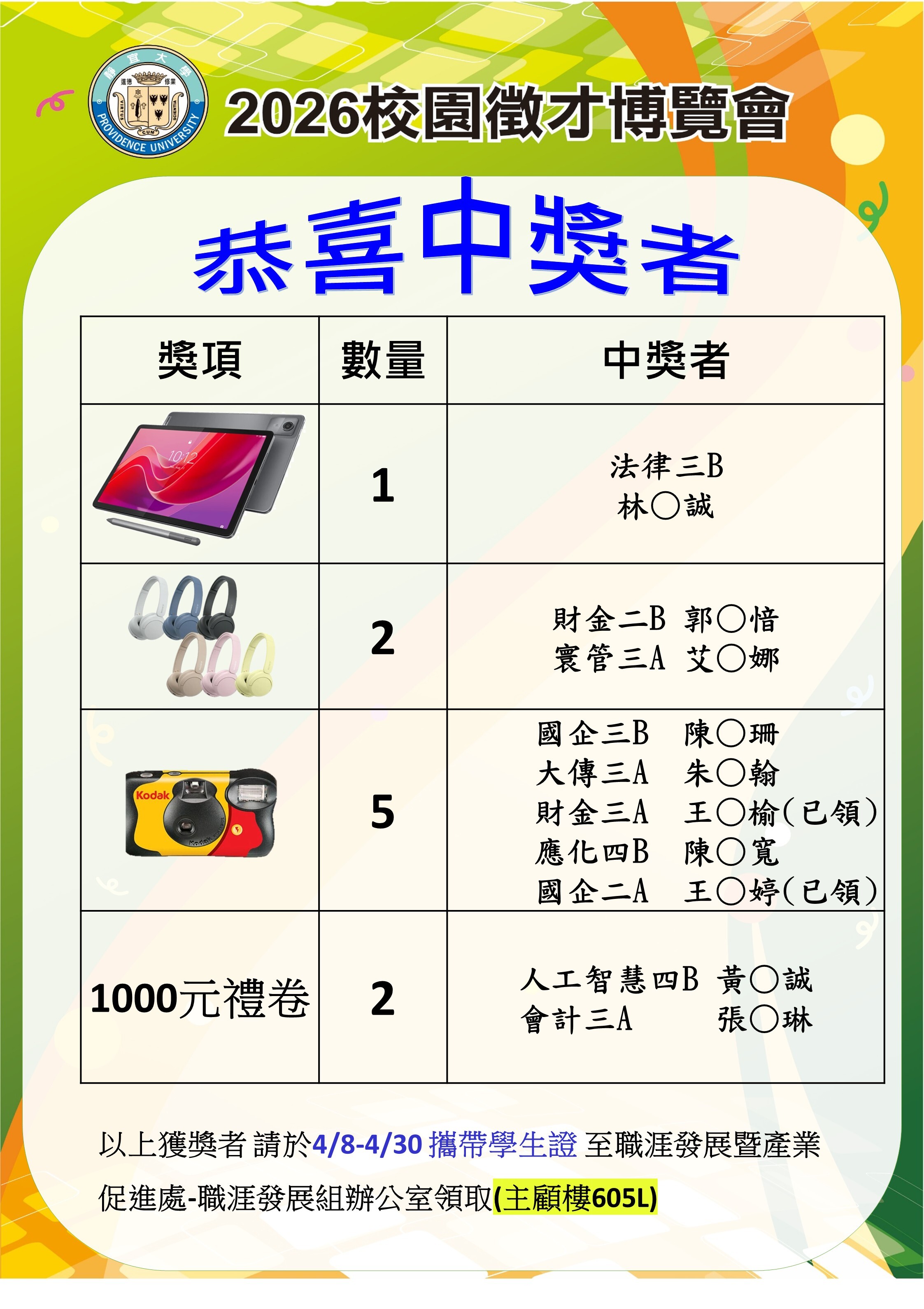 恭喜獲獎同學 請於 4/8-4/30 攜帶學生證至職涯發展暨產業促進處-職涯發展組辦公室(主顧605L)領取