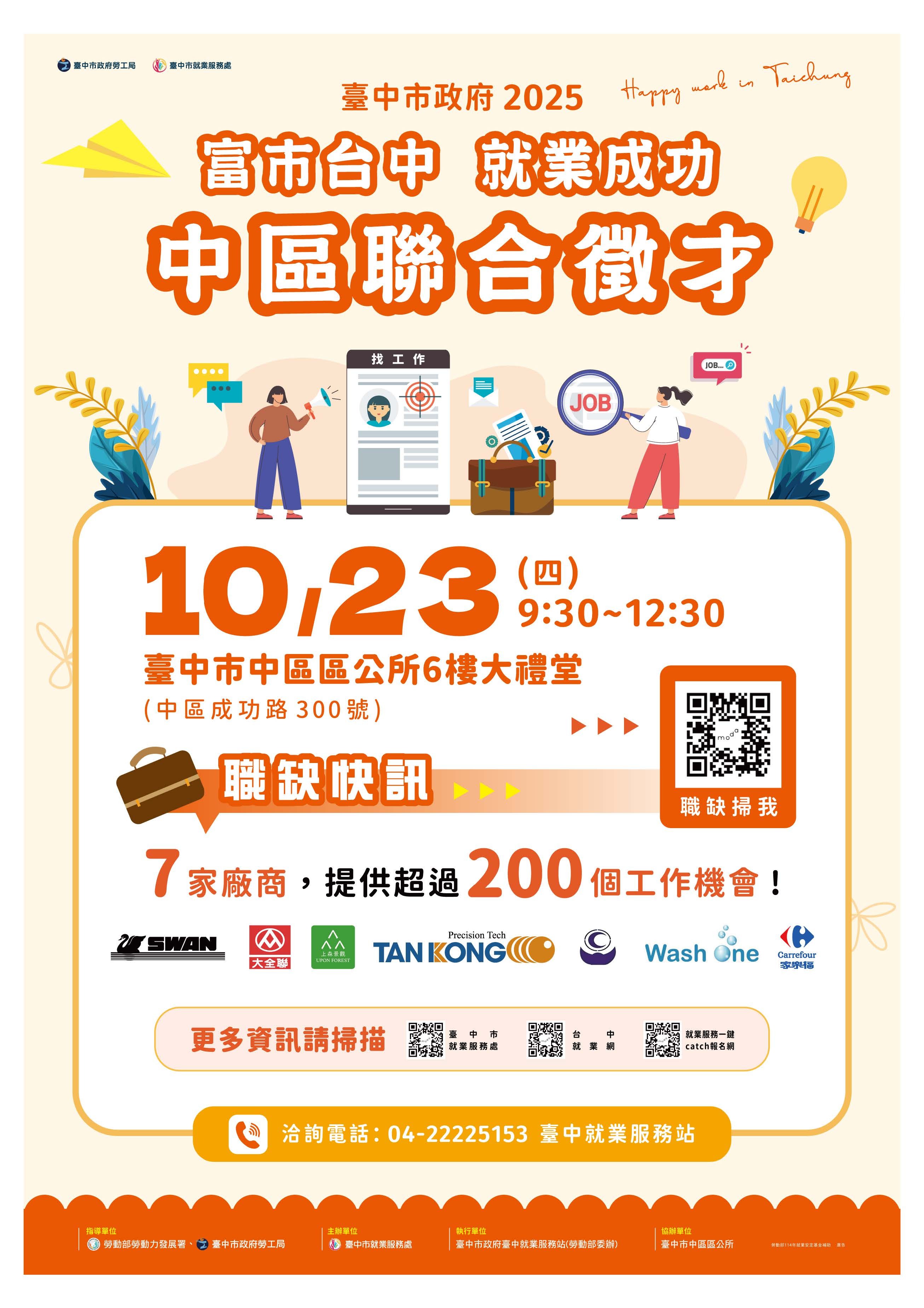 臺中市政府10月23日上午9:30至12:30,在臺中市中區區公所6樓禮堂舉辦2025「富市台中 就業成功」中區聯合徵才,
