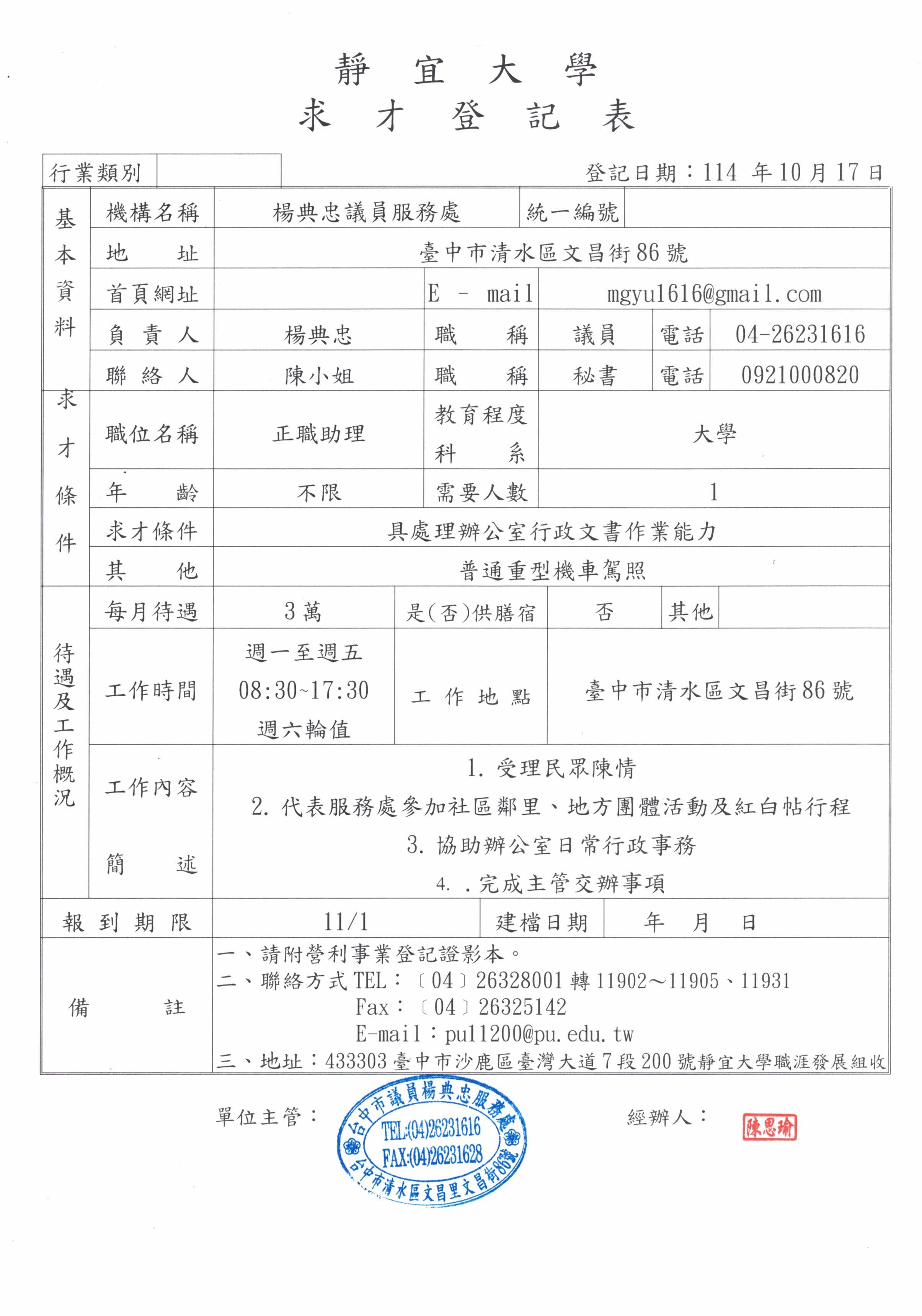 市議員楊典忠服務處徵才公告