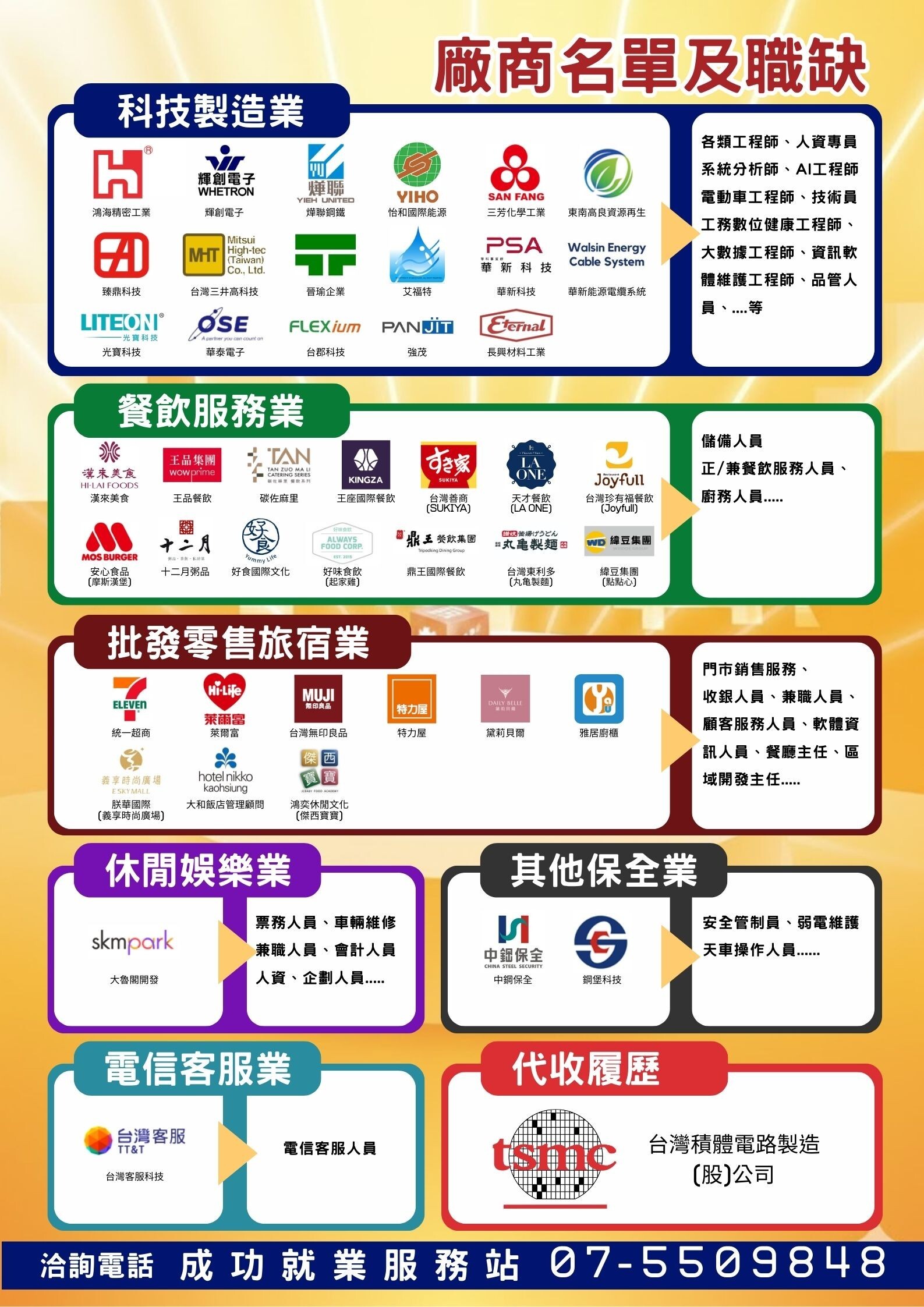 包含鴻海精密、光寶科技、長興材料、漢來美食(島語)、王品集團、無印良品、日航酒店、sukiya、點點心、本村炸雞、台灣客服等45家企業,提供工程師、技術員、資訊軟體維護、正兼職餐飲服務人員、餐廳主任、儲備幹部、門市人員、人資、計時人員等職缺。