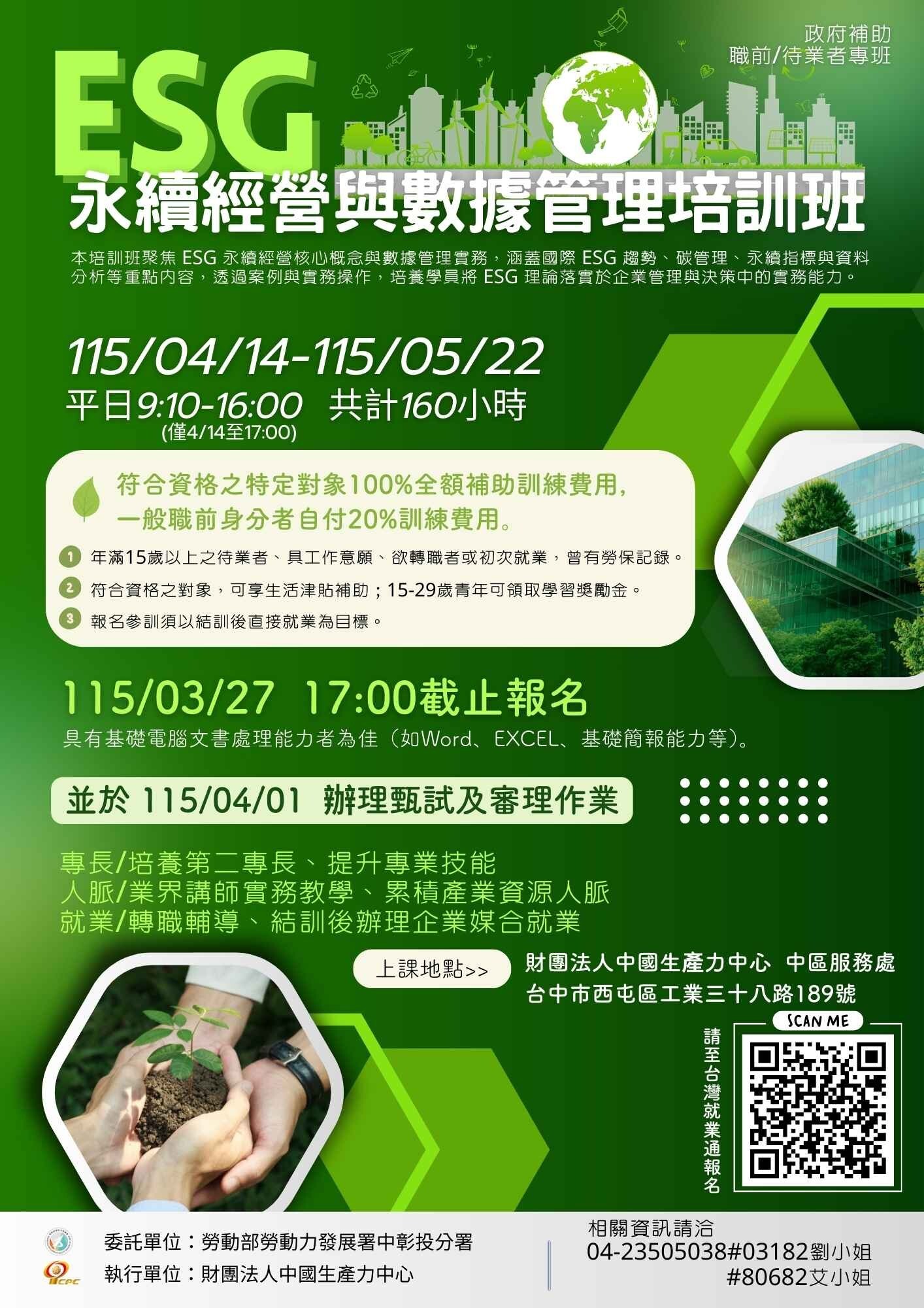 114-116年度產業人才培訓據點計畫-ESG永續經營與數據管理培訓班(職前班)